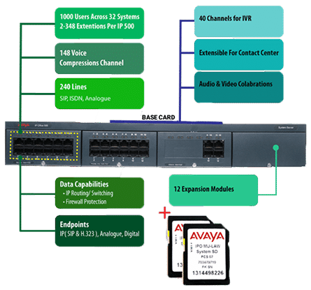 مرکز تلفن آوایا آیپی آفیس ۵۰۰ (Avaya IP Office 500 Platform) شامل یک یونیت پایه (Base Unit) است که از ۴ کارت پایه که هر کدام هم میتوانند حامل یک کارت ترانک باشند، پشتیبانی میکند.